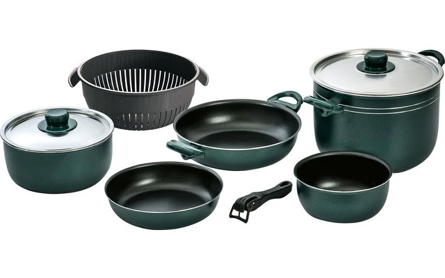 Ineinander stapelbares Alu-Topfset mit hochwertiger Antihaftbeschichtung innen. Abnehmbare Griffzange. Inklusive Trage-/Verschlussgurt (100% Polyester).